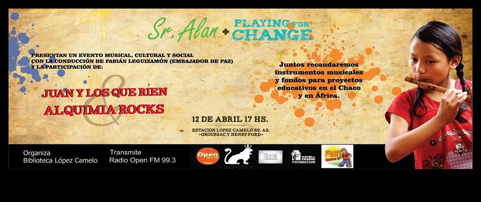 El Sábado 12 de Abril en la Estación de Lopez Camelo ubicada en Tigre, Buenos Aires, se llevará a cabo la iniciativa "Música al mundo" respaldada por la fundación internacional Playing for Change donde estaremos tocando en vivo. Los esperamos!!!